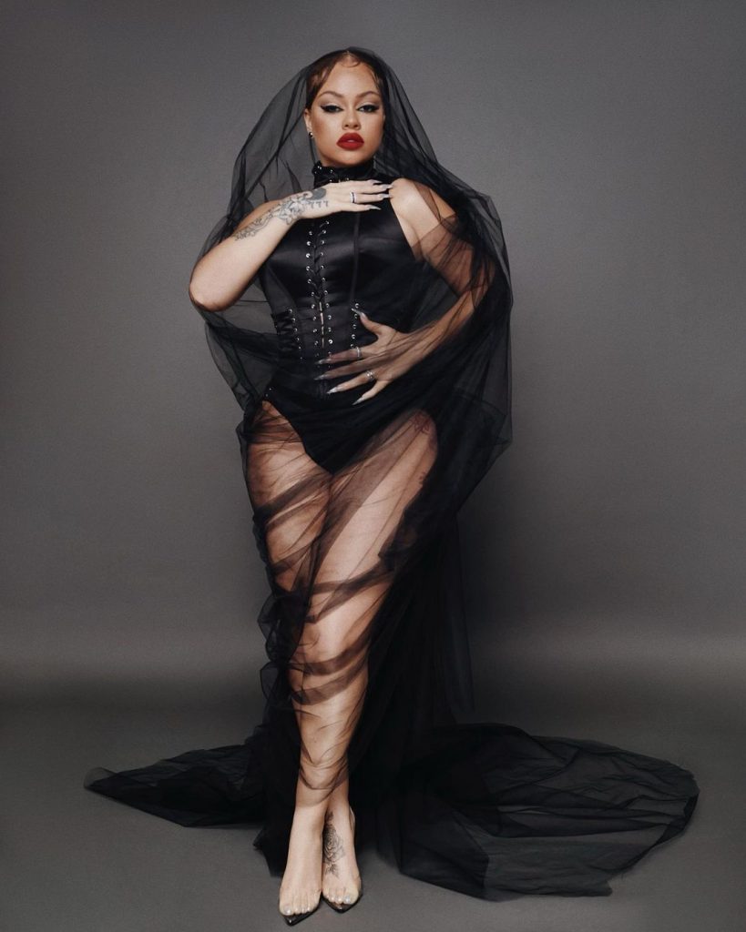 American rapper Alyssa Michelle Stephens, professionally known as Big Latto, dressed in an all-black, custom-made Dilara Findikoglu outfit, like the omen on the red carpet at the 2022 American Music Awards.