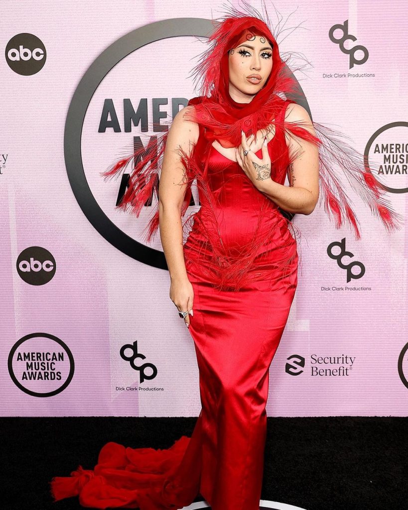 American pop singer-songwriter Bebe Rexha attended the 2022 American Music Awards red carpet, this time opting for all red as she donned a custom-tailored Buerlangma tulle gown coupled with gloves by Atelier Biser. She embraced her queen vibes making a grand entry by taking up most of the carpet in her strikingly enormous red dress embellished with big ruffles from the shoulders to the skirt. The latter featured a long train gracefully trailing behind her and sweeping the red carpet, underscoring her beautiful face.