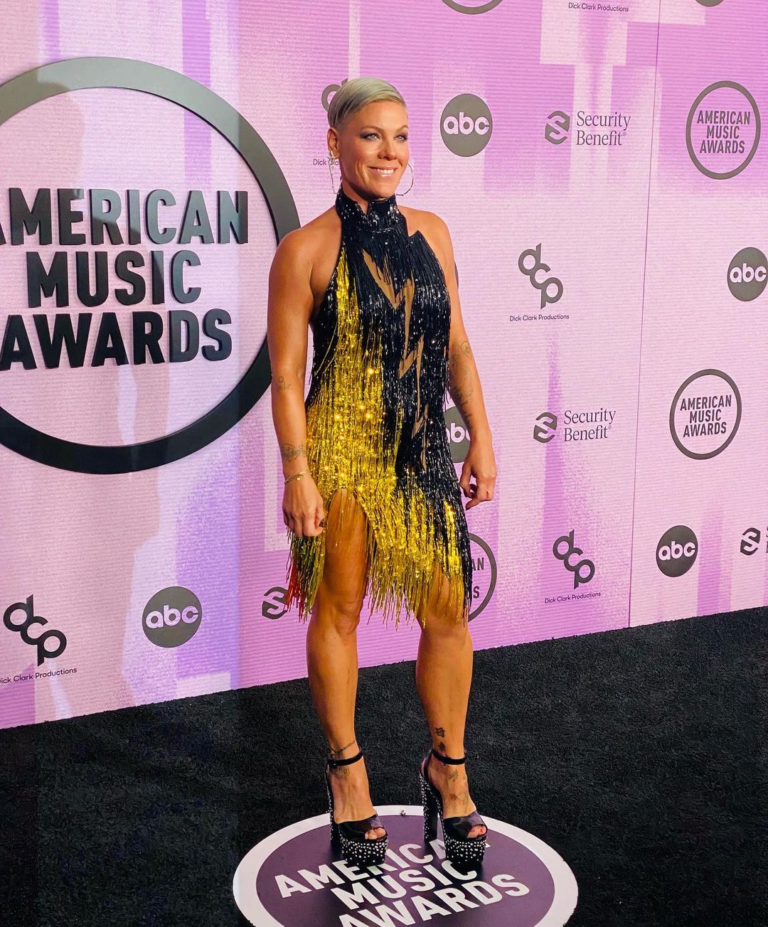 P!nk, as customary, became one of the evening’s distinguished red carpet impressions with her elegant yet vibrant style, as she dressed in a green and black fringed mini-dress by Bob Mackie and Cher with no back to show off her toned legs. The black fringe blending in with the green fabric gave the impression that a lightning bolt was passing over her chest as a unique attention to detail.