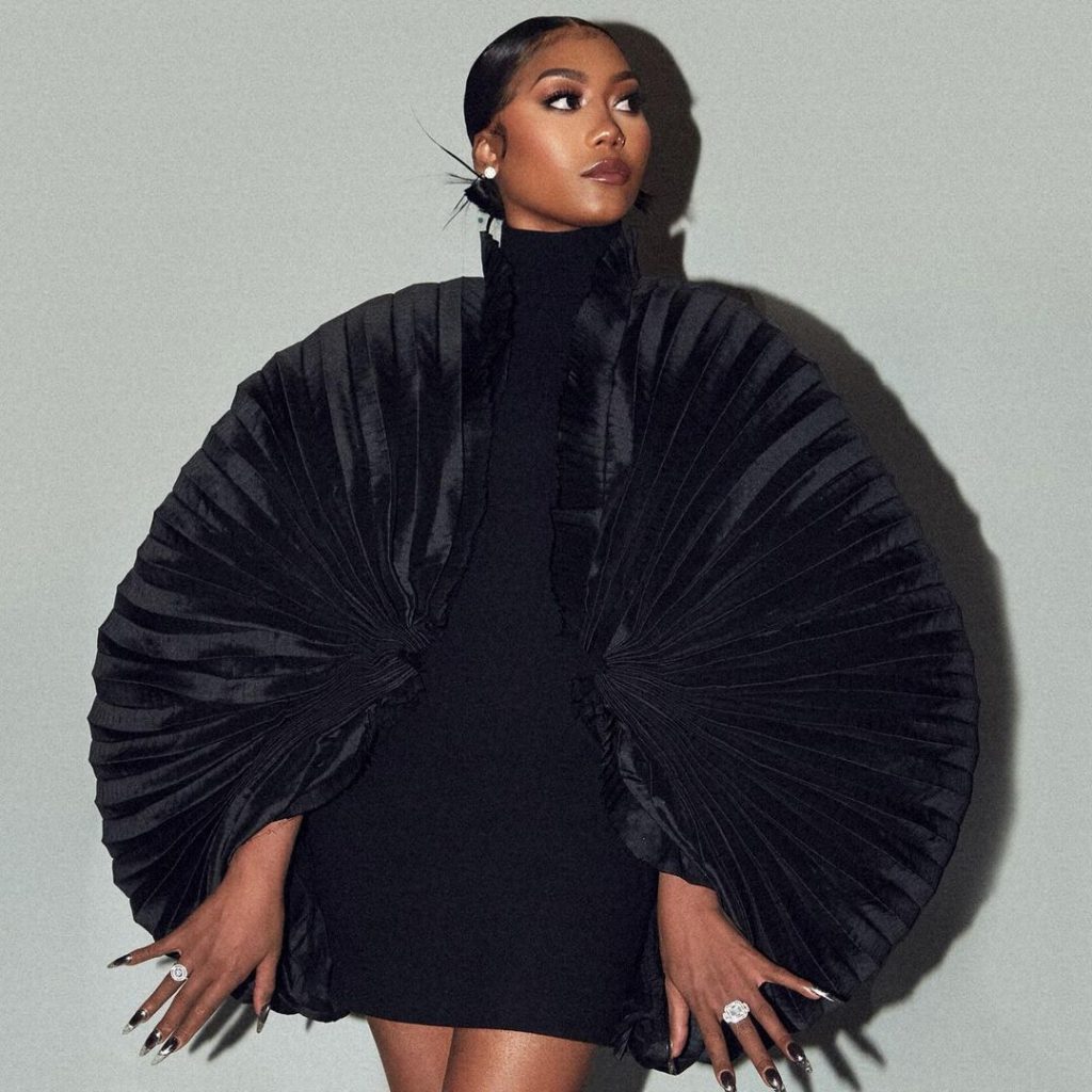 Muni Long arrived in an eye-catching design by Spanish designer Juana Martin, as she opted for a knee-length pleated gown with fan-shaped sleeves.