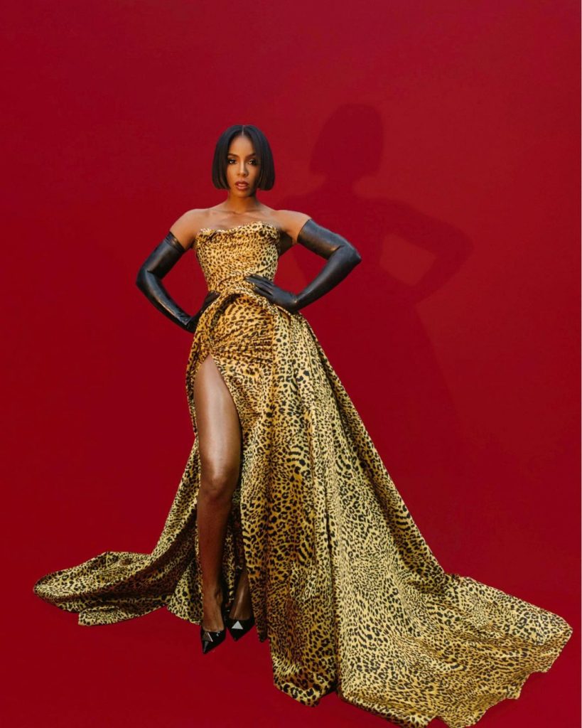 Kelly Rowland unveiled her wild side as she swaggered down the red carpet in a spring 2022 couture dress right from the runway, comprising a strapless leopard-print Nicolas Jebran gown, looking slick and stylish as ever. It featured a high side slit with a dramatically long train and ruched fabric details on the bodice and sweetheart neckline to create a ripple-like effect. She finished her look with a pair of long black leather gloves, black pointed-toe stilettos, glamorous makeup look and a sleek blunt-cut bob hairdo.