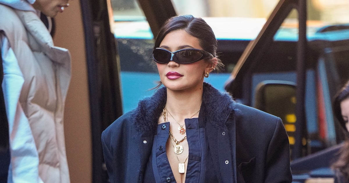 Kylie Jenner was spotted out shopping with sister Kendall on Tuesday, Nov. 8 — just one day after the CFDA Awards at Casa Cipriani, where she debuted an artful vintage Thierry Mugler dress. Jenner, 25, indulged in a go-to trend for the season: wearing a cardigan as a shirt. The sweater, buttoned only once at her bust line, made for a plunging moment and also revealed a sliver of skin above her high-waisted jeans. Jenner’s denim pooled at her feet, dragging the sidewalk and allowing for just a subtle glimpse of her pointed-toe shoes. She layered on a fuzzy hooded zip-up and oversize black coat, finishing off the look with a pair of sporty Balenciaga sunglasses; a leather shoulder bag; and gold necklaces that peeked through the opening at her neckline. Later in the day, she swapped her pumps for lug-sole flats.