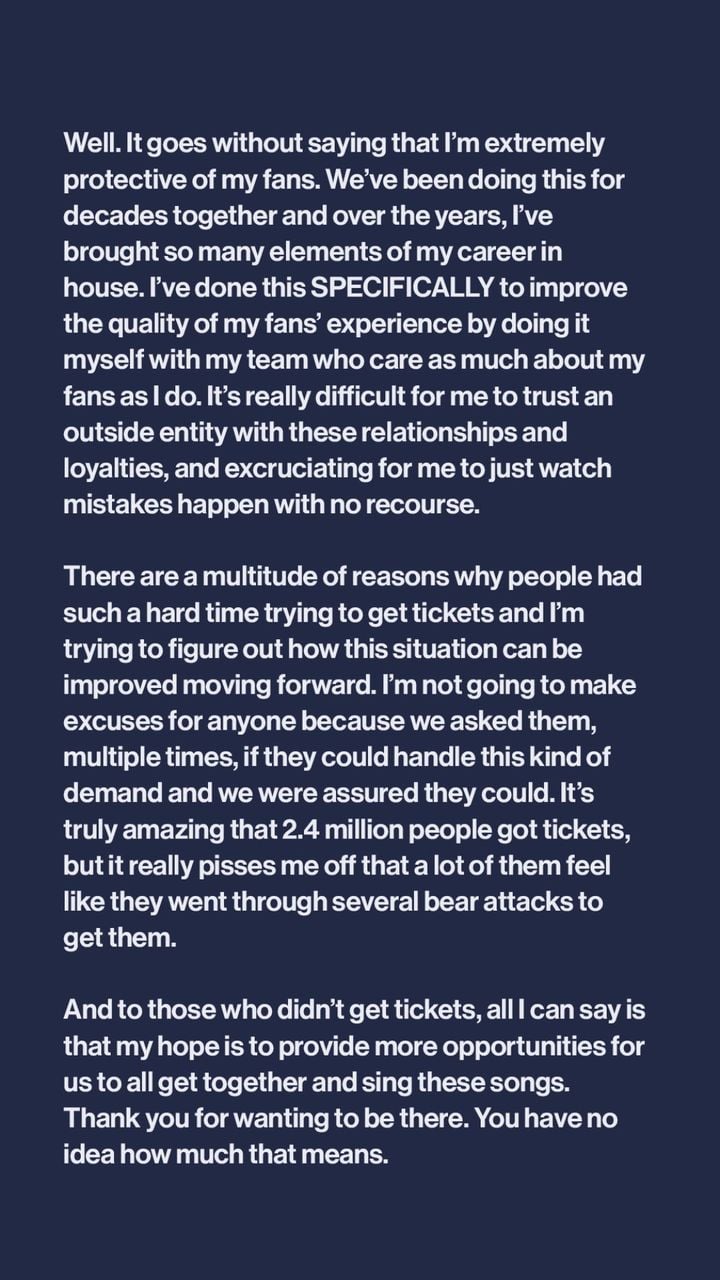 She continued: “There are a multitude of reasons why people had such a hard time trying to get tickets and I’m trying to figure out how this situation can be improved moving forward. I’m not going to make excuses for anyone because we asked them, multiple times, if they could handle this kind of demand and we were assured they could. It’s truly amazing that 2.4 million people got tickets, but it really pisses me off that a lot of them feel like they went through several bear attacks to get them. And to those who didn’t get tickets, all I can say is that my hope is to provide more opportunities for us all to get together and sing these songs. Thank you for wanting to be there. You have no idea how much that means.”