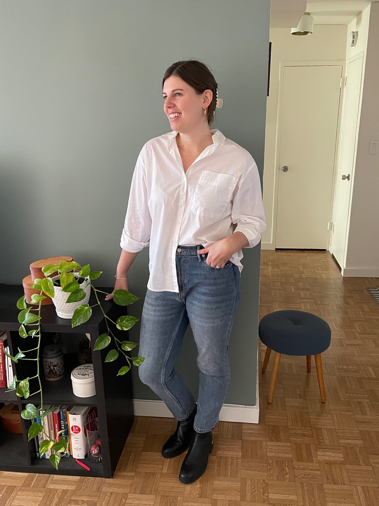From the classic cut to the oversize pocket, this shirt is incredibly versatile. The first time I wore it, I styled it simply with jeans and Chelsea boots. Another day, I layered it over a graphic tee and miniskirt. You could also wear it under a blazer or sweater vest for a workwear look. Since I ordered the shirt in pure white, I know I’ll be able to wear it with a variety of outfits for years to come.
